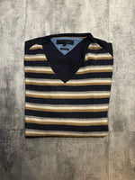 đź‘• || Pull Tommy Hilfiger Ă rayures horizontales bleues marines, beiges et grises. Col V. Logo de la marque sur la poitrine et au niveau du col.