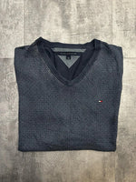 👕 || Pull col V Tommy Hilfiger, bleu marine avec un motif discret. Coupe classique et confortable. Parfait pour un look décontracté et élégant.