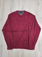 👕 || Pull col V Tommy Hilfiger, couleur bordeaux, idéal pour un look décontracté et élégant.