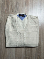 👕 || Pull col V Tommy Hilfiger, couleur crème, avec des rayures horizontales et une tresse centrale.