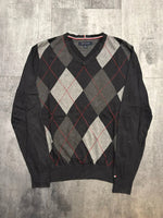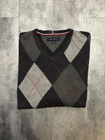 đź‘• || Pull Tommy Hilfiger, col V, Ă carreaux noir, gris et rouge.