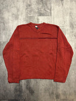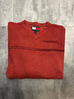 👕 || Pull Tommy Hilfiger, col V, couleur rouge brique avec des lignes rouge foncé au niveau de la poitrine. Fabriqué au Japon.