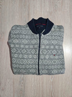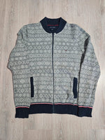 👕 || Cardigan Tommy Hilfiger, gris à motif, avec fermeture éclair et col, poignets et taille bleu marine.